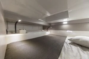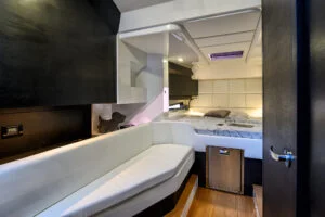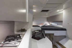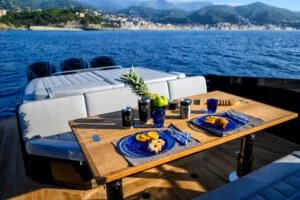 A sundeck aft adjoins the dining area with a sofa and table with adjustable legs. The bar counter is equipped with a barbecue, fridge, ice maker and numerous storage compartments. Behind the bar is the cockpit with three magnificent sports seats and a carbon fibre dashboard.